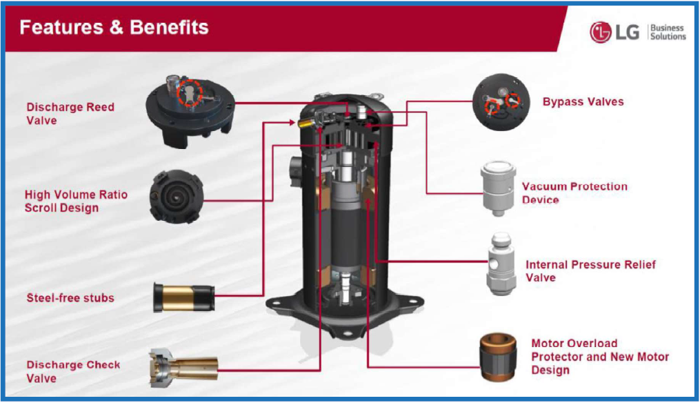 Advanced LG scroll compressor – Reliable and energy-efficient LG scroll compressor, featuring advanced safety enhancements such as a pressure and vacuum relief valve, discharge temperature thermostat, and an improved reed valve.